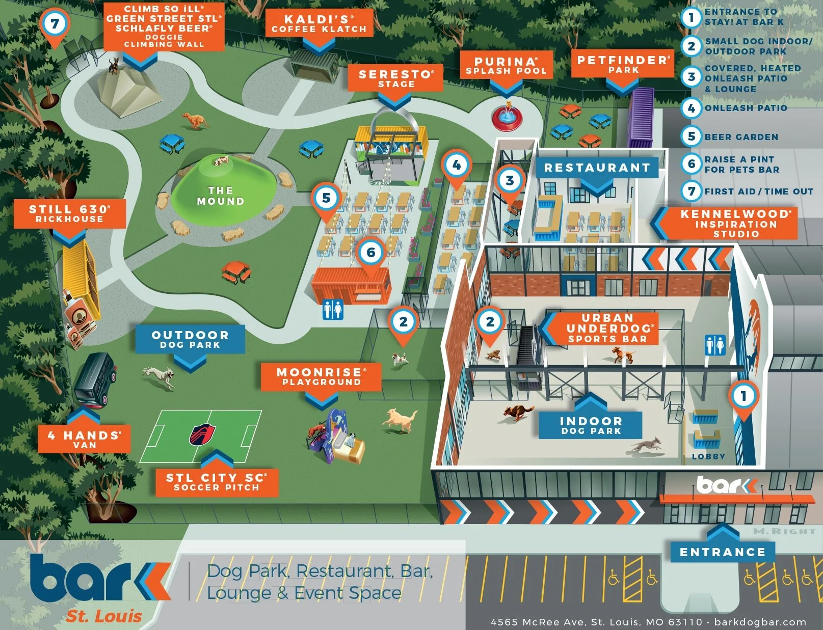 Bar K is a fully-staffed dog park, modern bar/restaurant and event space. Our event will take place at Petfinder Park (see map below).